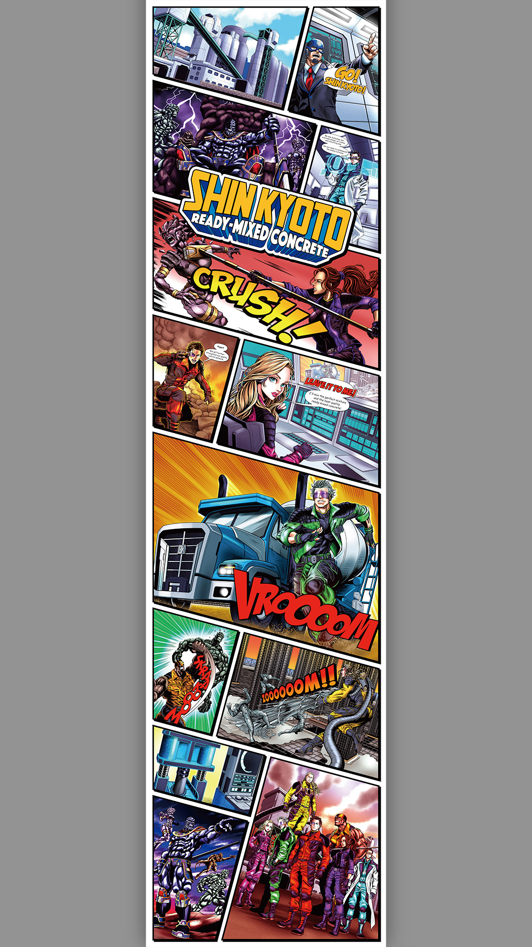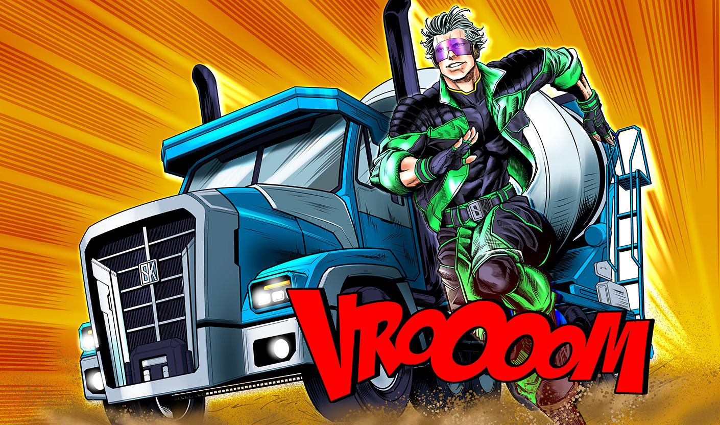 今回は、弊社(リライトスタジオ)にて以前制作したスーパーヒーローのキャラクターを活かしたデザインにしたいとのご要望をいただきました。目を引くキャラクターが描かれたミキサー車が日々京都の現場へ向かって走り回ることで、インパクトのある「動く広告塔」として会社の認知拡大に繋げることを目指しました。