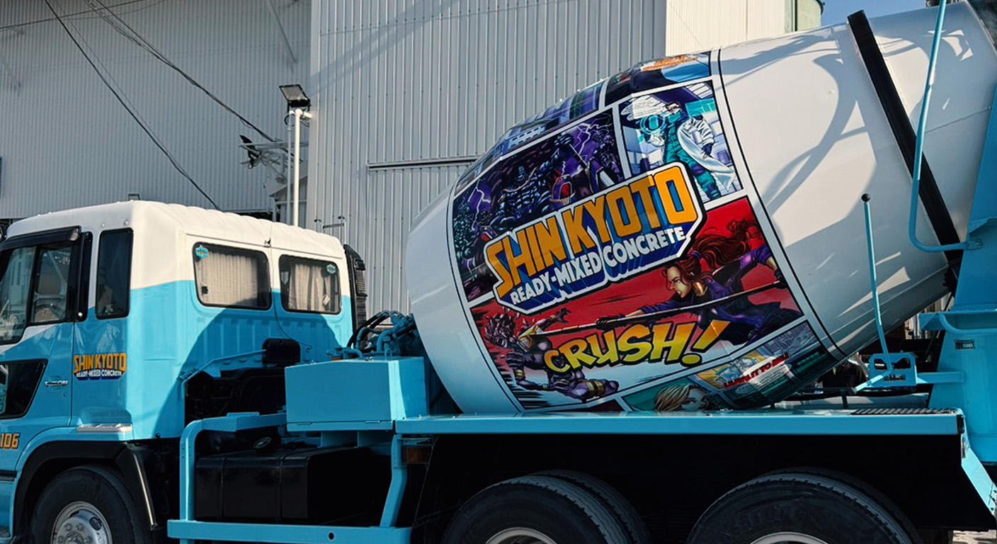 京都府に拠点を置く「新京都生コン株式会社」様のミキサー車において、ドラム部分に施すラッピング用オリジナルイラストを制作いたしました。